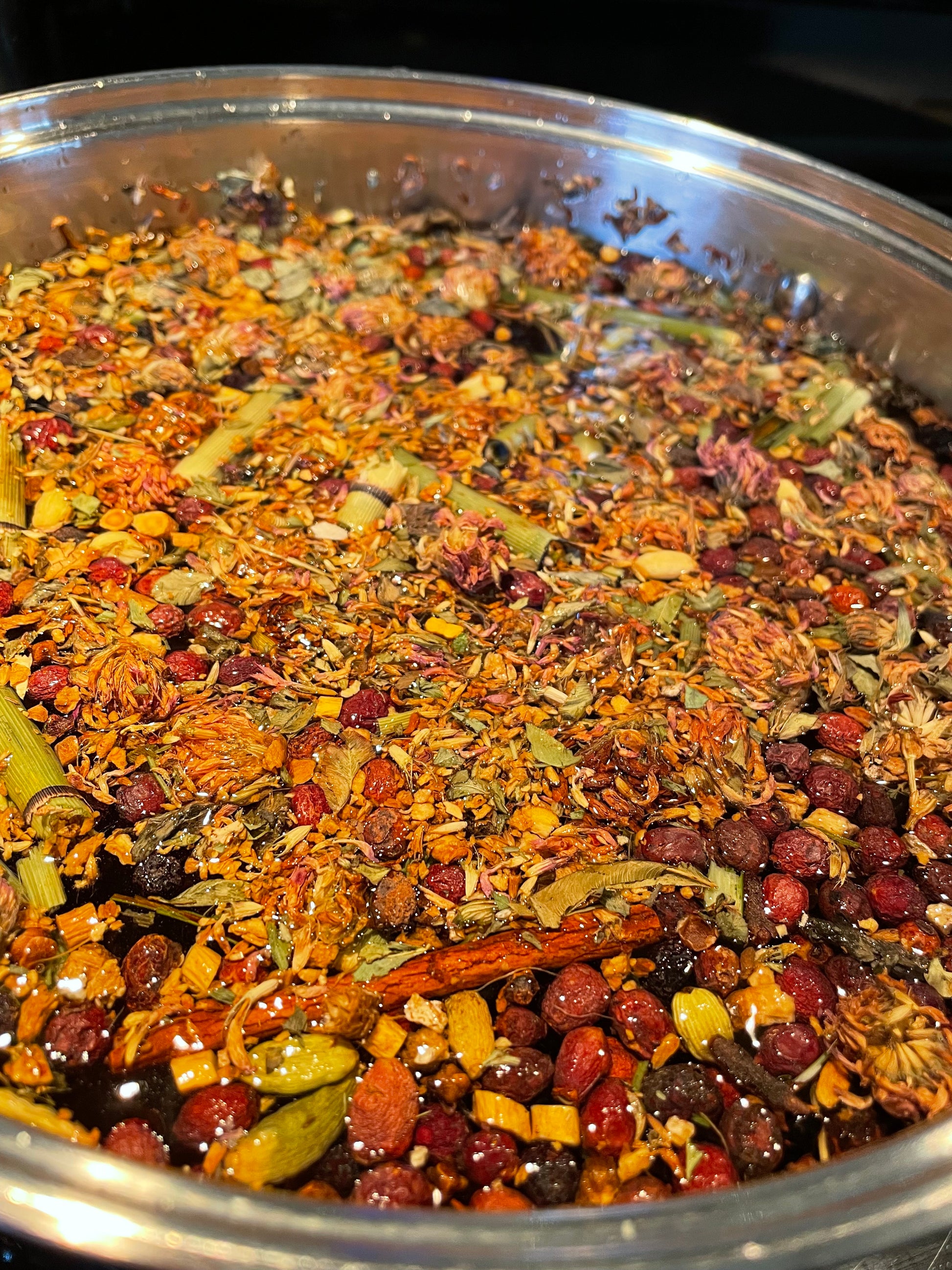 Hawthorn berry*, aronia berry*, rosehips*, pomegranate aerils*, astragalus root*, burdock root*, ginger root*, red clover*, cinnamon bark*, cardamom*, horsetail shavegrass**, clove*